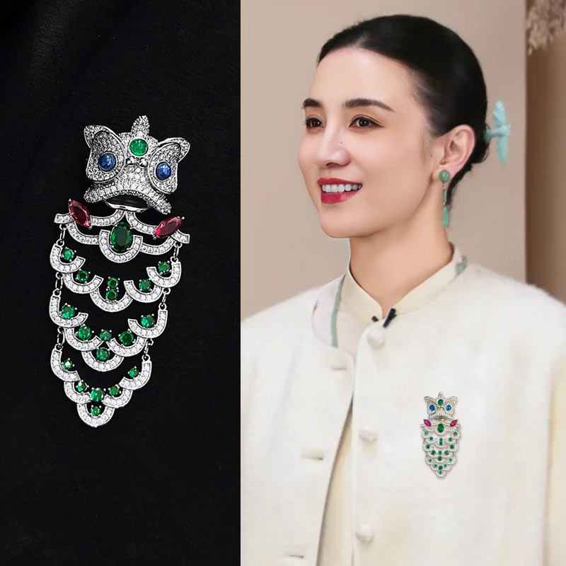 艺术国潮醒狮胸针女中国风红色喜庆立体高档胸花镶嵌大衣别针配饰