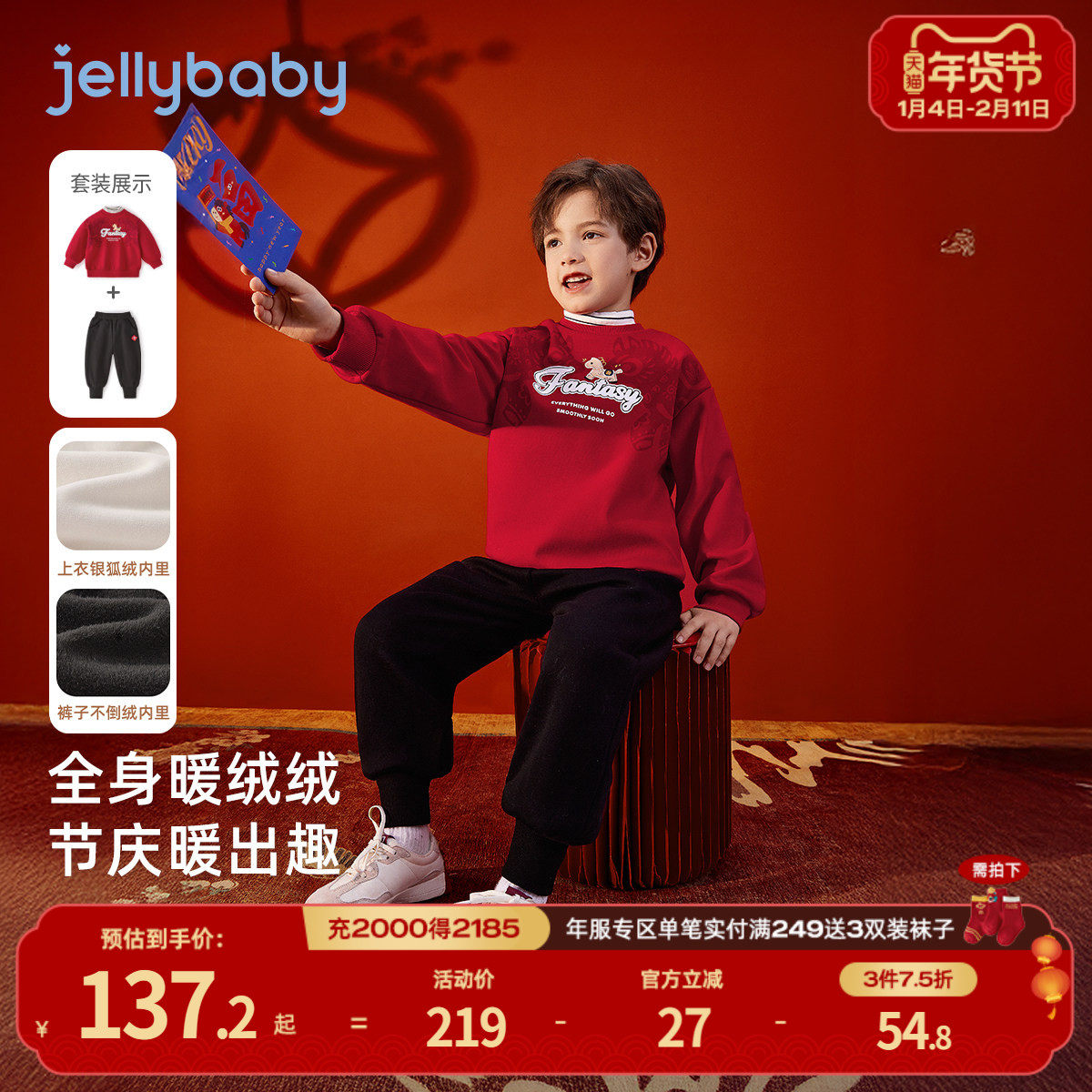 真维斯童装男童套装男孩本命年加绒过年服儿童冬季加厚红色拜年服