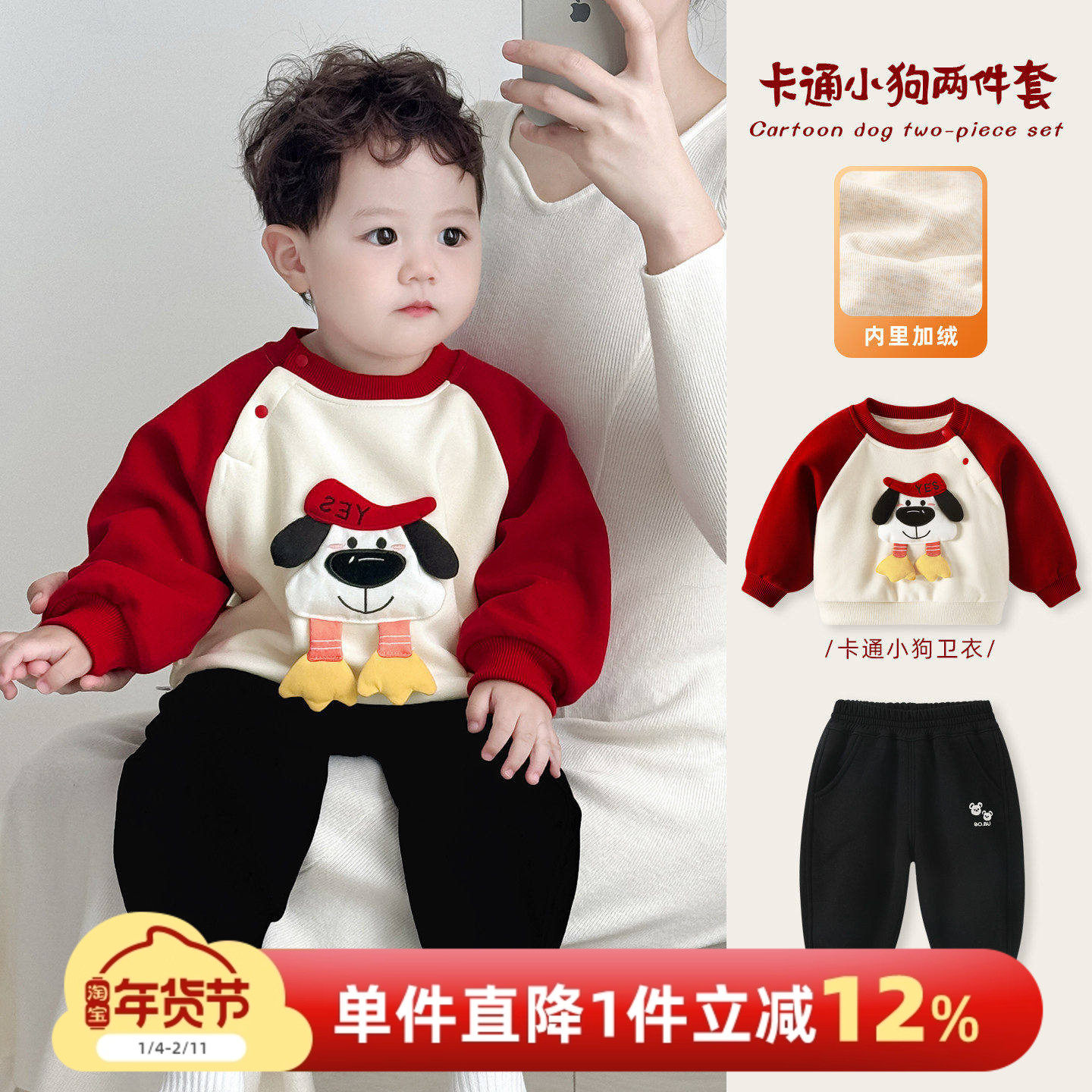 男童套装秋冬男宝宝红色两件套冬装儿童拜年衣服加厚婴儿周岁卫衣