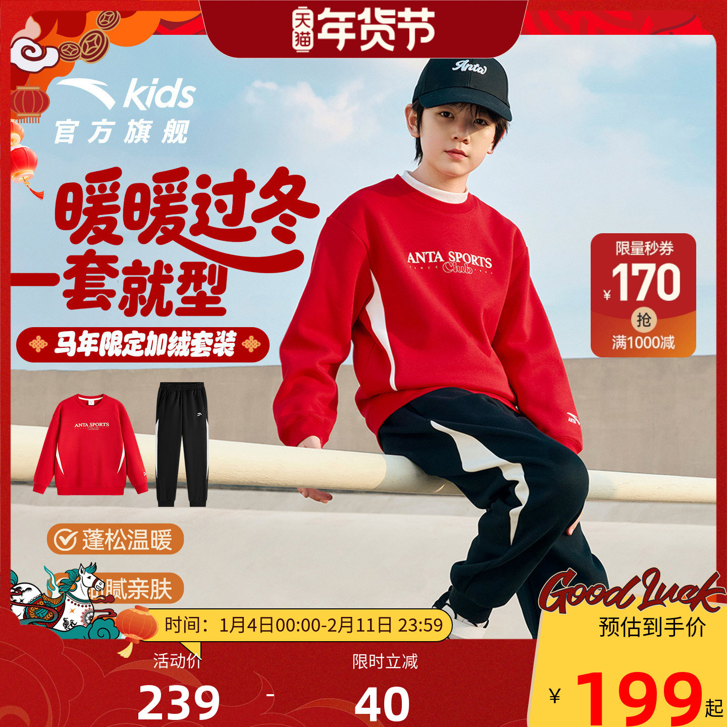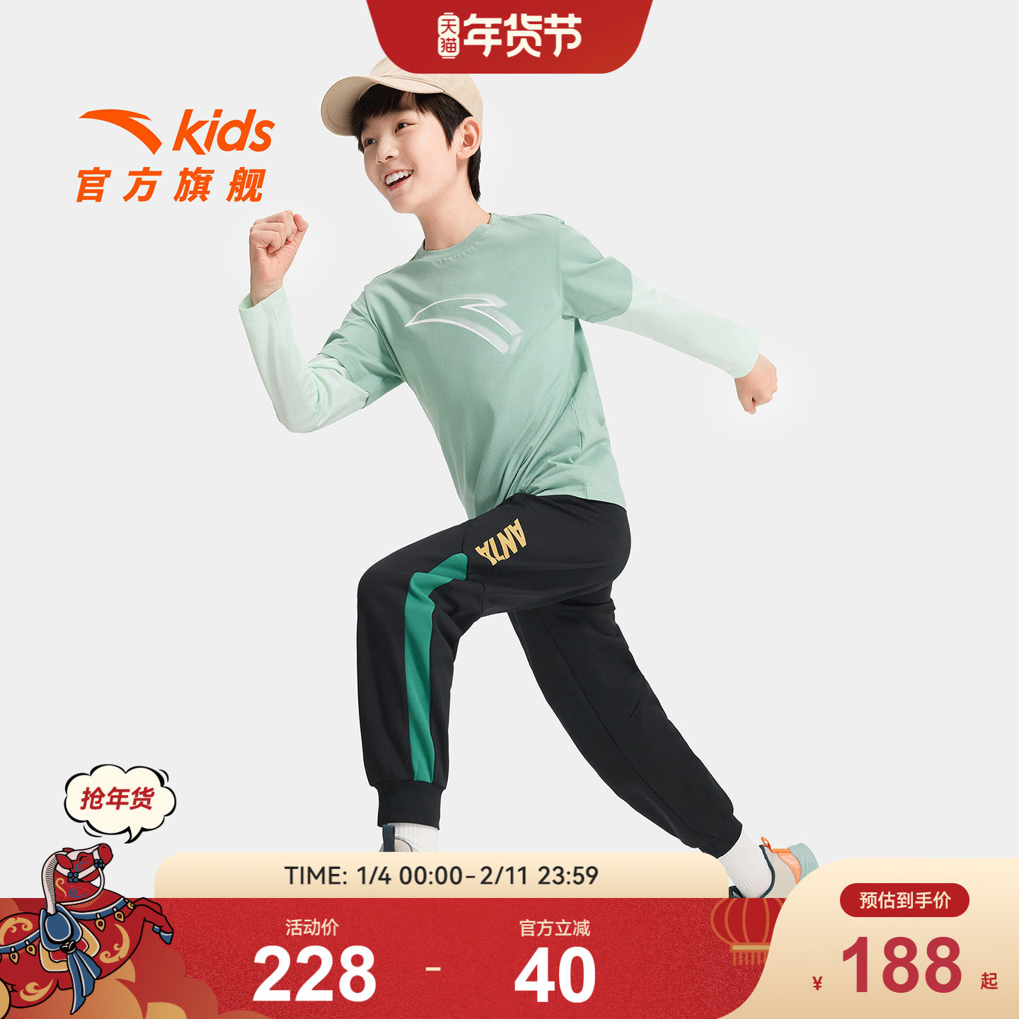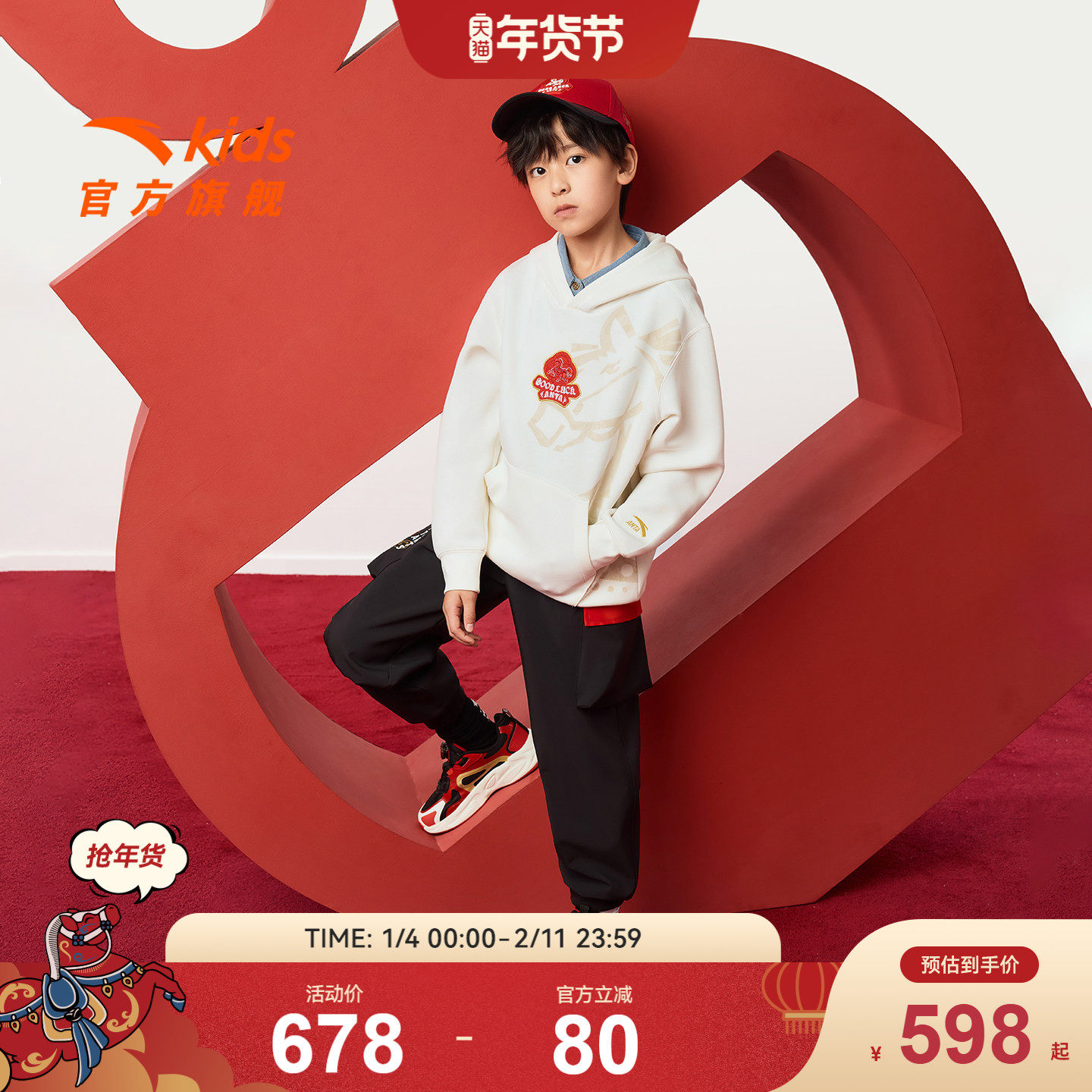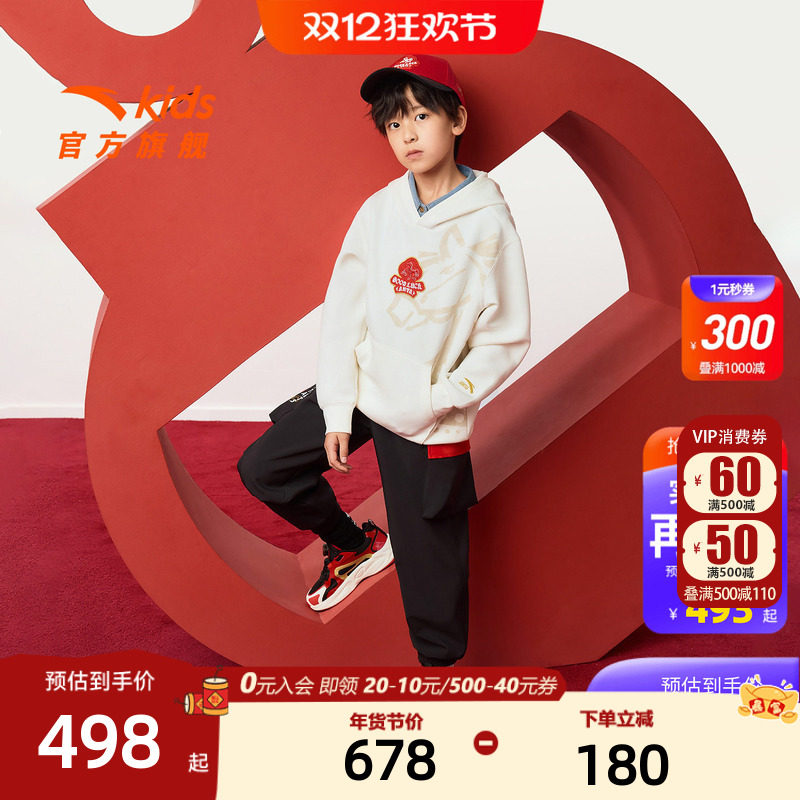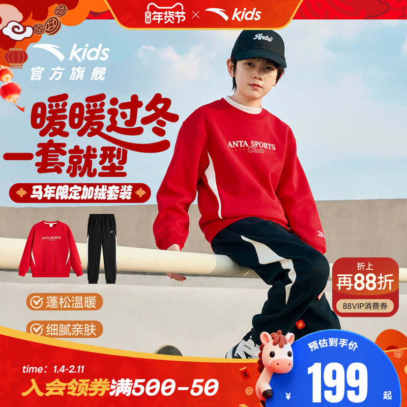 新年马年安踏儿童卫衣男童连帽套头2026年新款卫衣裤子男童套装
