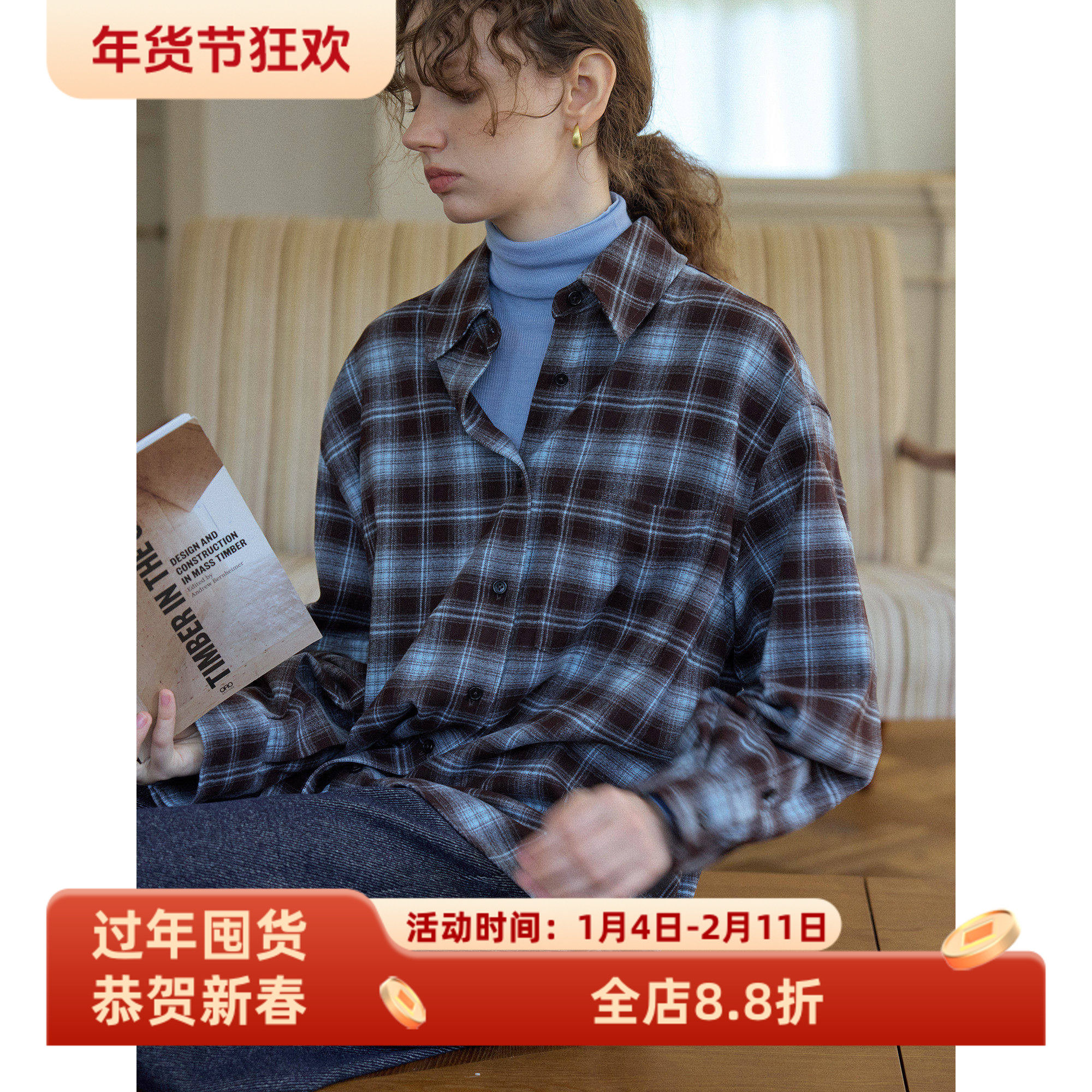 蓝色磨毛撞色格纹廓形宽松长袖衬衫女秋冬款复古格子叠穿内搭衬衣