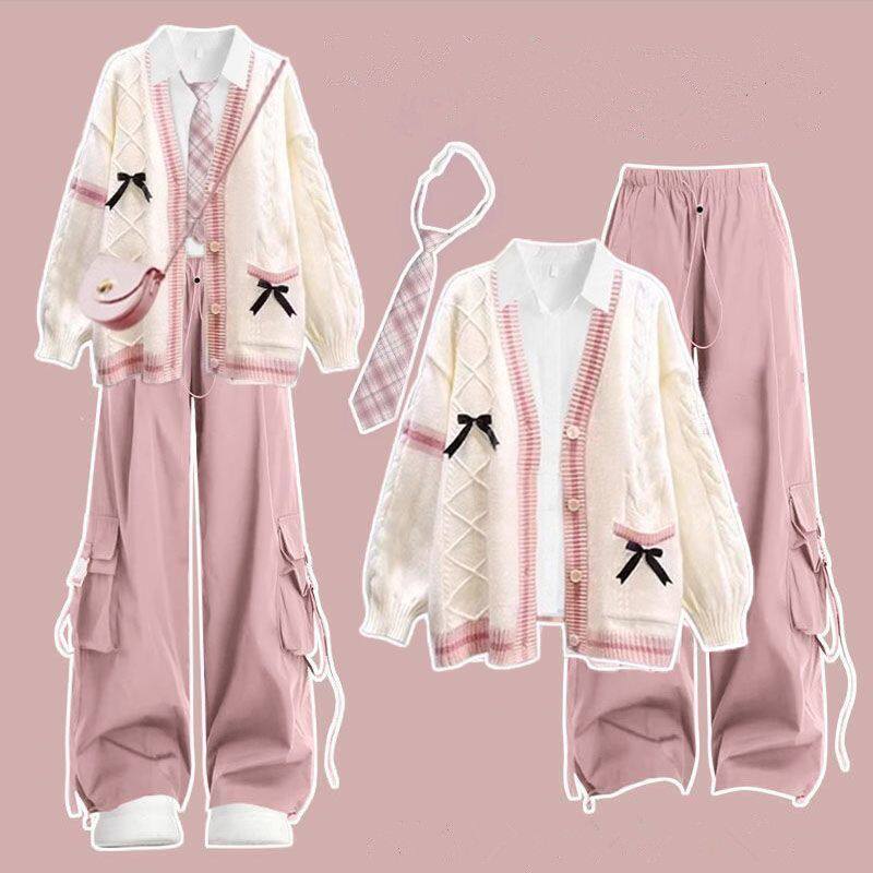 2025秋冬款韩系学生穿搭开衫毛衣女+衬衫+领带+粉色工装裤四件套