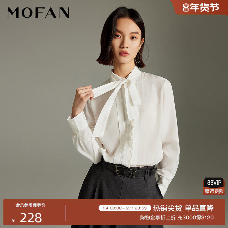 时髦立领飘带设计感休闲衬衫女MOFAN摩凡2025冬款白色木耳边衬衣
