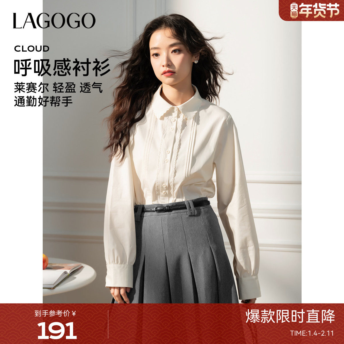 【莱赛尔】LAGOGO法式花边衬衫女拉谷谷2025秋冬款米白色通勤上衣