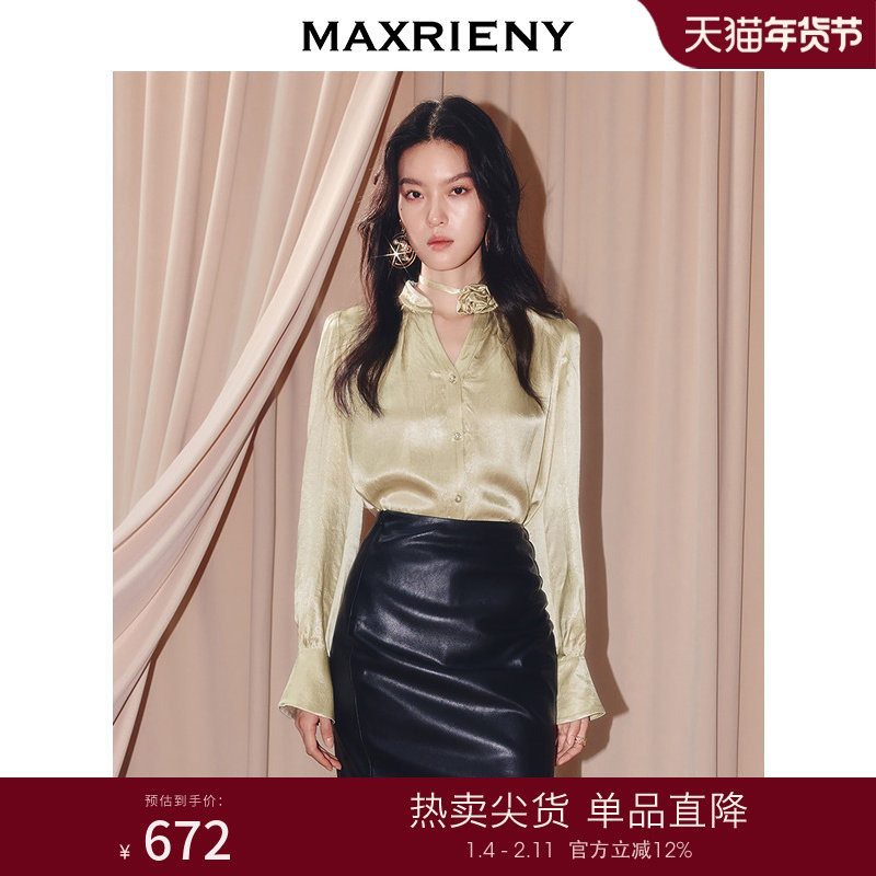 MAXRIENY软实力风穿搭v领醋酸衬衫女25冬款通勤风宽松长袖上衣