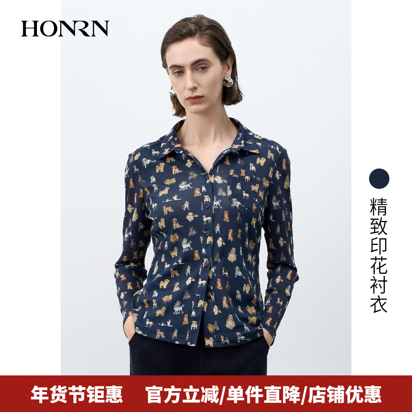 HONRN/红人精致印花翻领衬衫女冬款上衣内搭打底HK55SY310