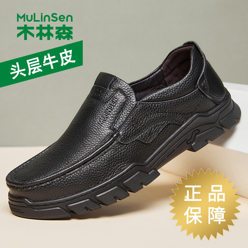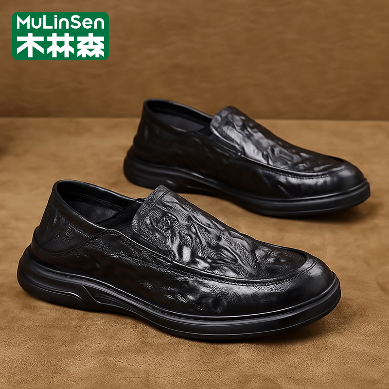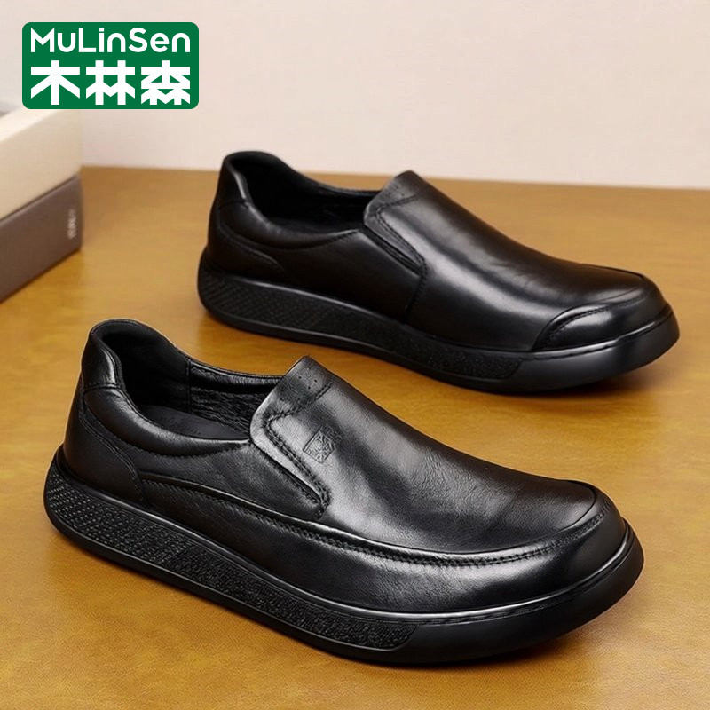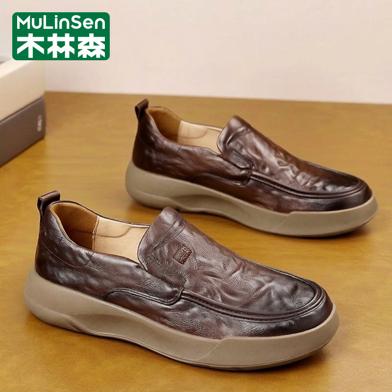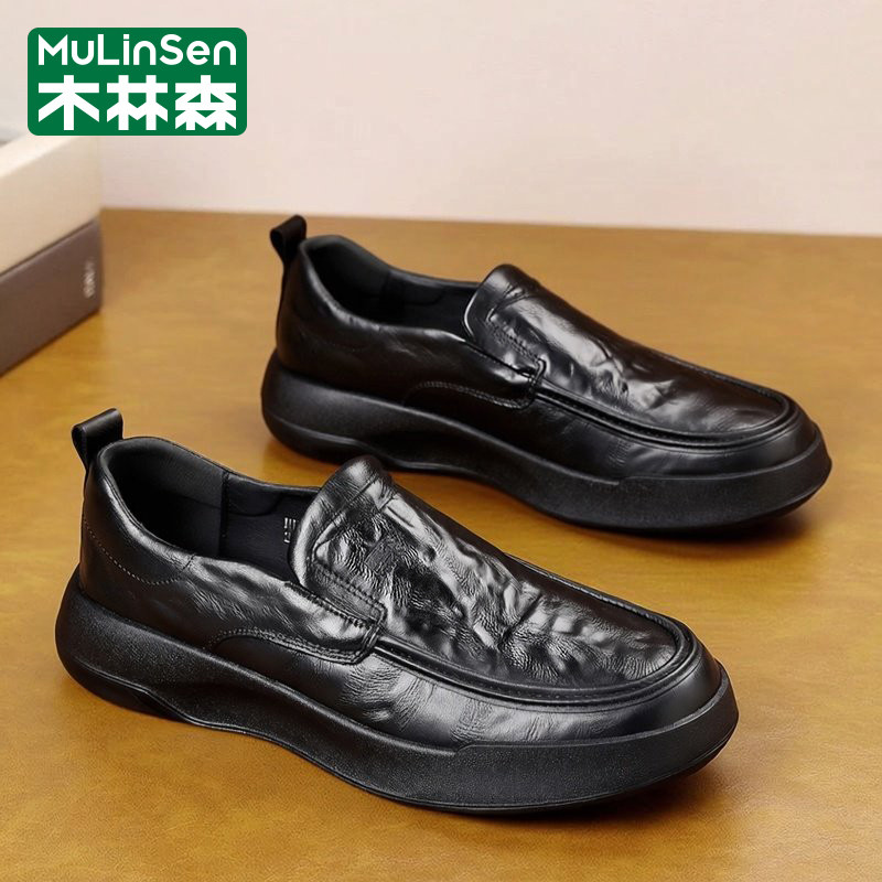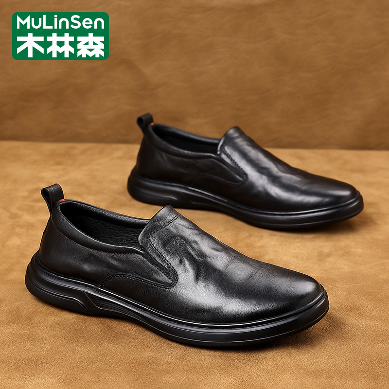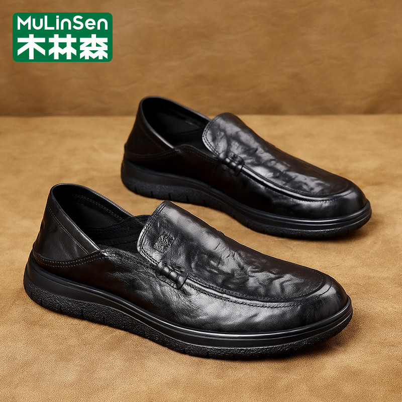 木林森皮鞋男款春季商务休闲头层牛皮一脚蹬板鞋爸爸软底乐福潮鞋