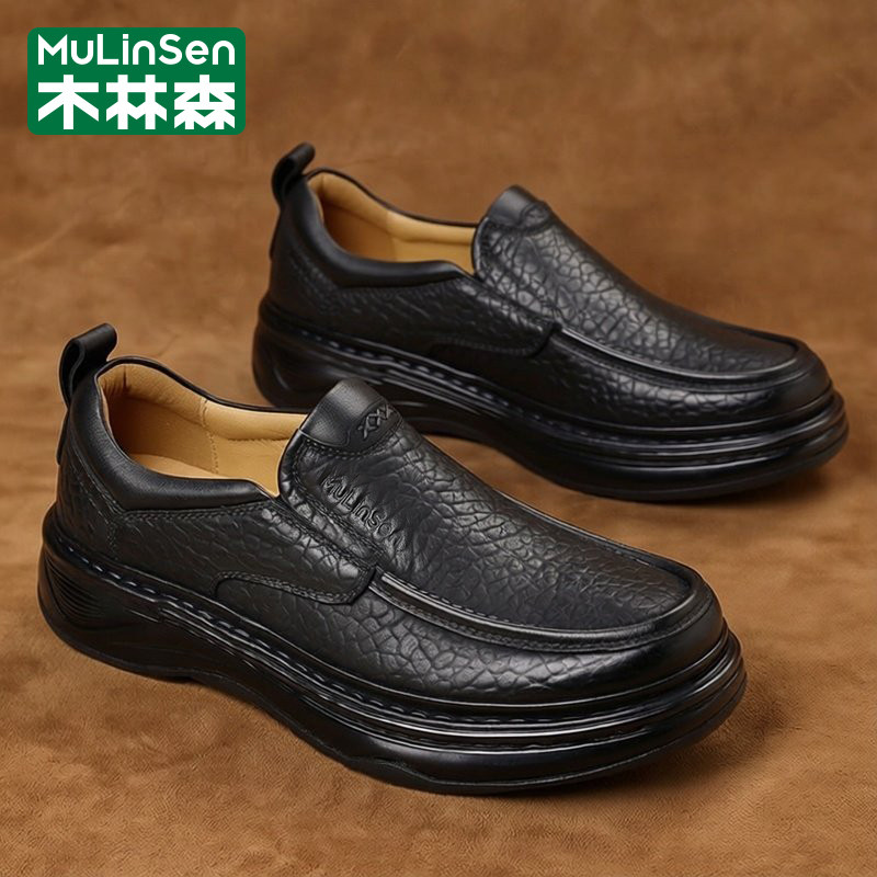木林森皮鞋男春季头层牛皮商务正装休闲大头宽楦爸爸厚底增高板鞋