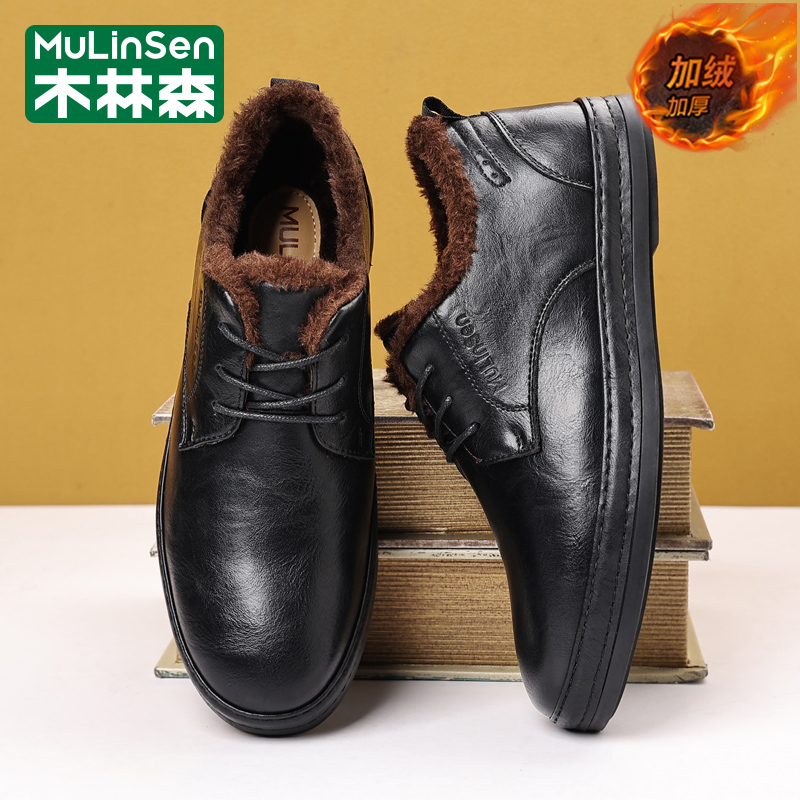 木林森皮鞋男冬季2025新款加绒加厚休闲商务英伦软底爸爸防寒棉鞋