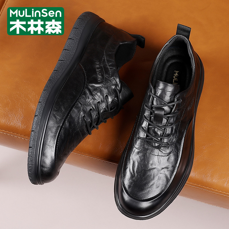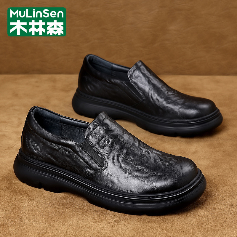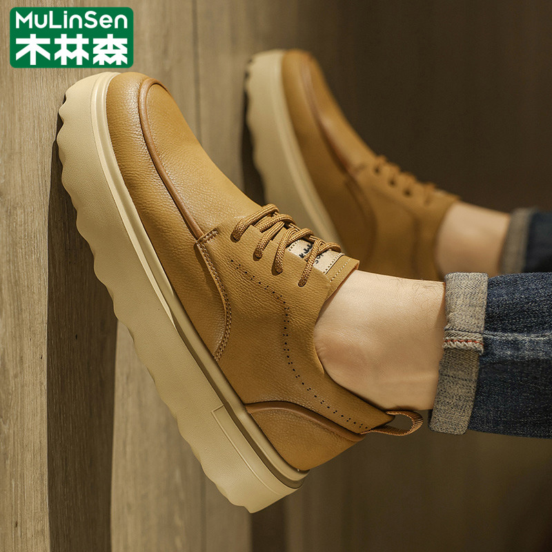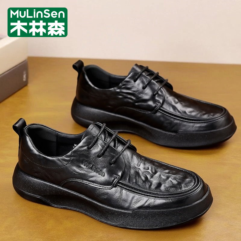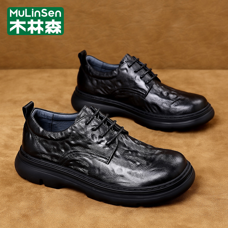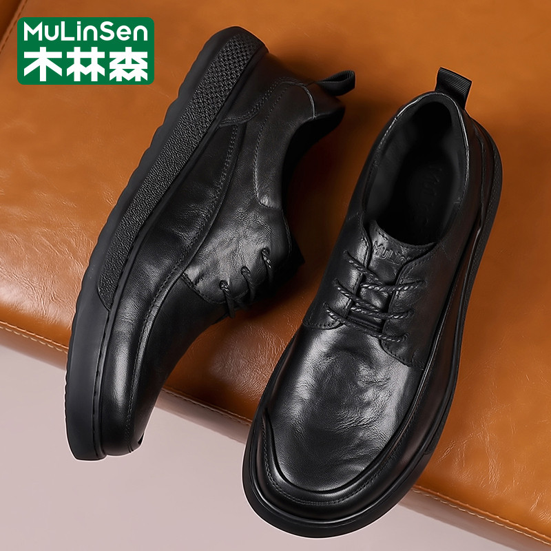 木林森皮鞋男春季头层牛皮商务英伦休闲大头宽楦爸爸厚底通勤潮鞋