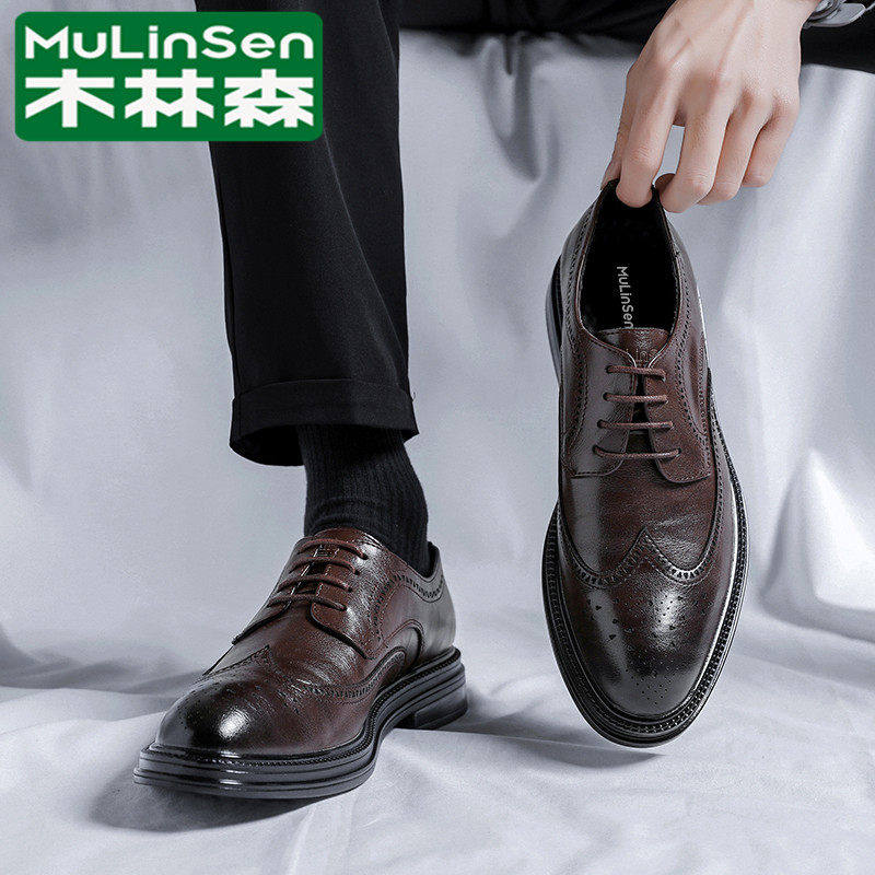 木林森皮鞋男韩版真皮透气软底休闲布洛克雕花商务正装新郎结婚鞋