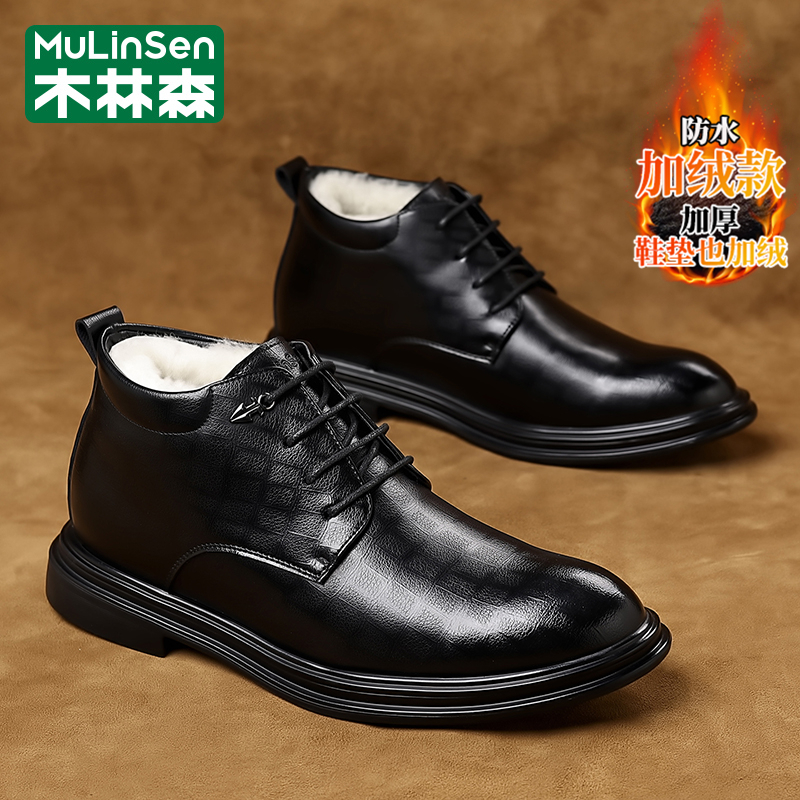 木林森男鞋2025冬季英伦商务正装皮鞋男款加棉休闲真皮内增高鞋子