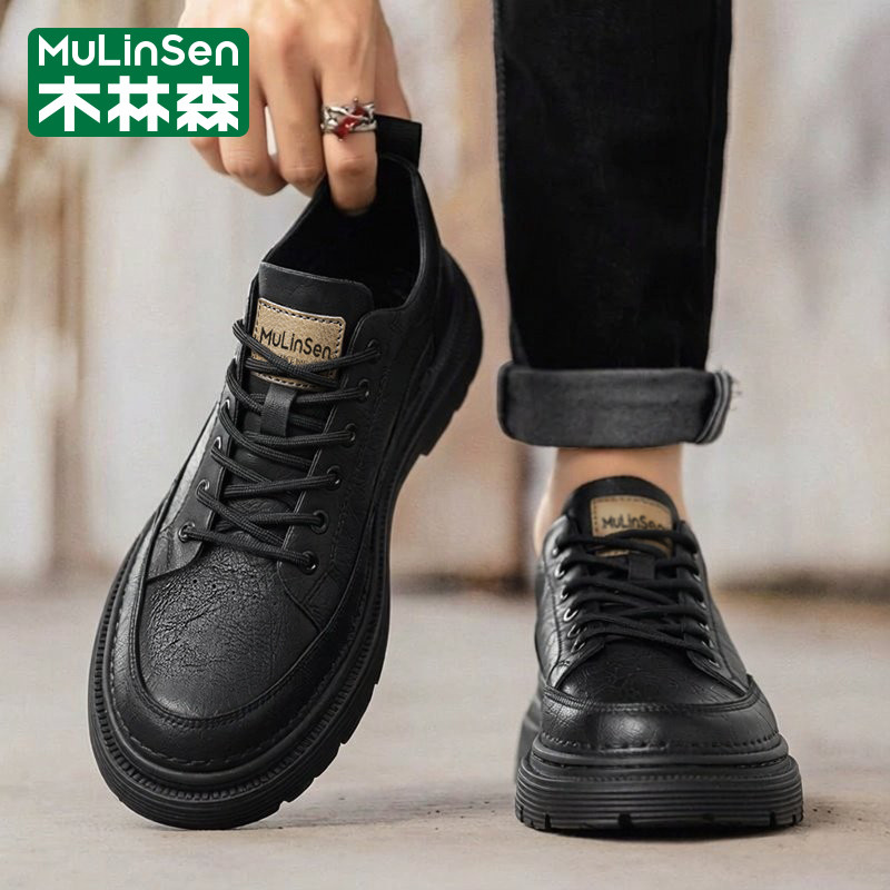 木林森皮鞋男2025新款冬季休闲英伦商务通勤工作黑色真皮爸爸板鞋
