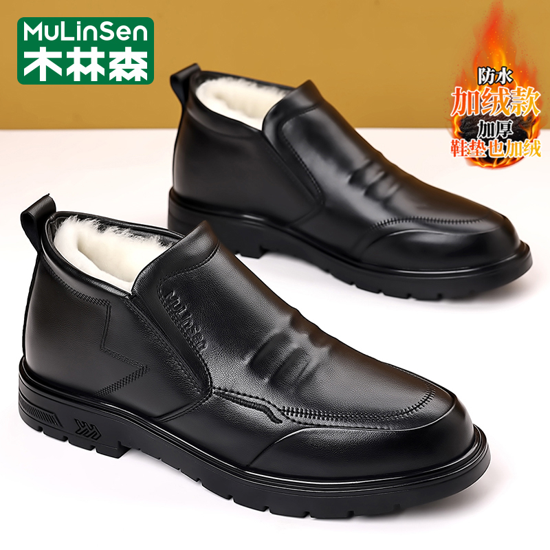 木林森皮鞋男冬季加绒保暖爸爸休闲商务羊毛一脚蹬东北中高帮棉鞋