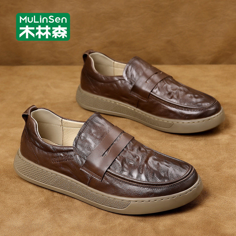 木林森皮鞋男款春季商务英伦休闲一脚蹬头层牛皮爸爸乐福软底板鞋