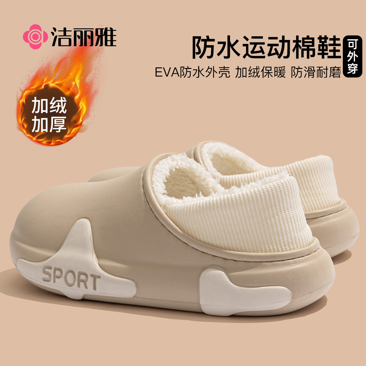 洁丽雅防水棉拖鞋男士冬季新款运动可外穿棉鞋加绒保暖防滑棉拖鞋