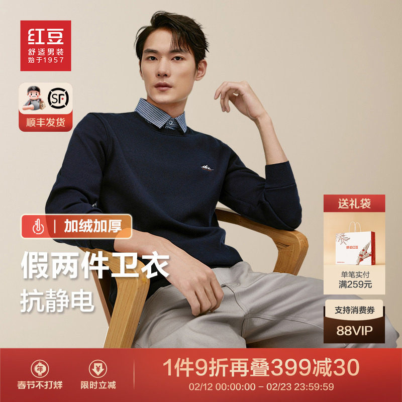 【牛奶绒】红豆男装加绒假两件毛衣男25秋冬衬衫领加厚假领子卫衣
