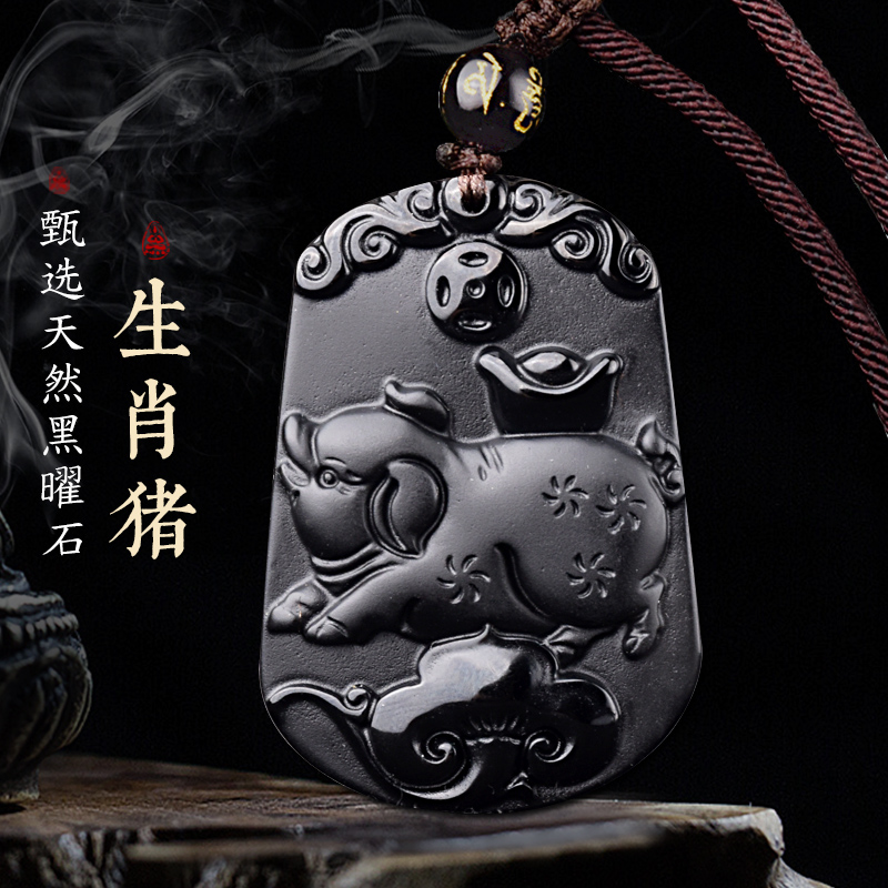 天然黑曜石猪吊坠十二生肖手工雕刻黑色水晶立体小猪福猪项坠男女