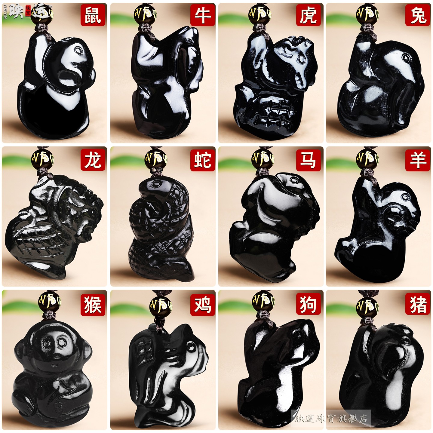 天然黑曜石十二生肖吊坠男女款本命年情侣礼物属蛇猴玉石项链挂件