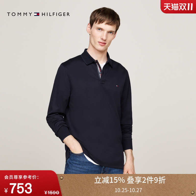 Tommy秋冬男装丝光棉经典绣标撞色门襟商务休闲翻领长袖T恤POLO衫