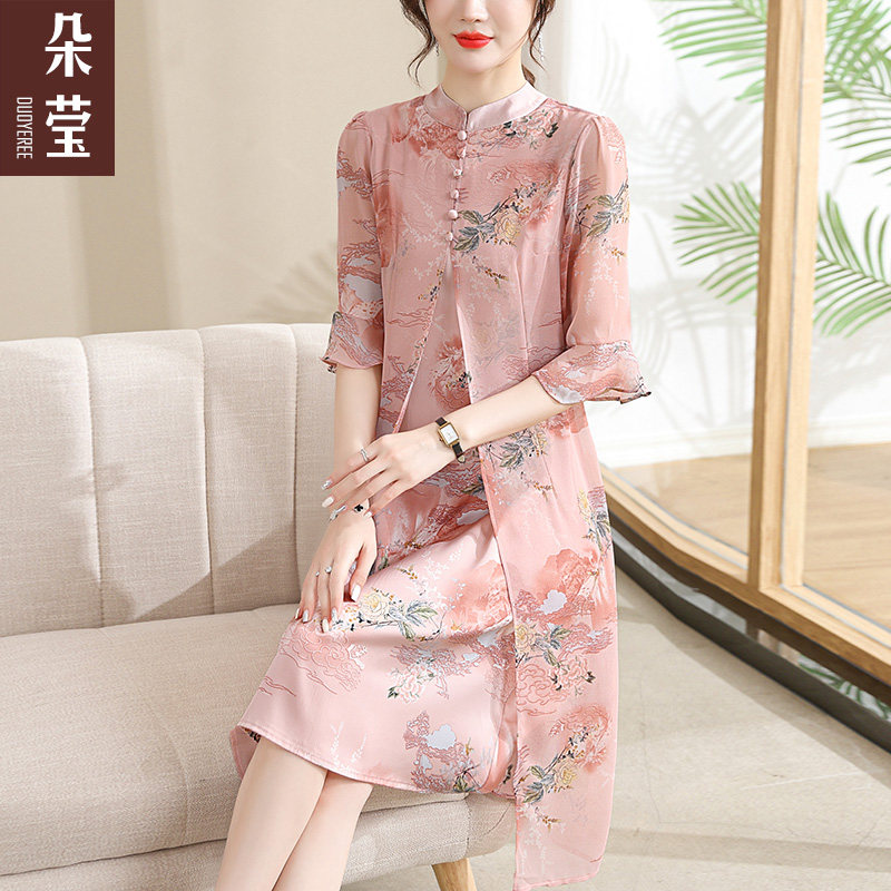 Q大码女装胖妈妈春装新款雪纺连衣裙时尚复古旗袍改良收腰显瘦裙