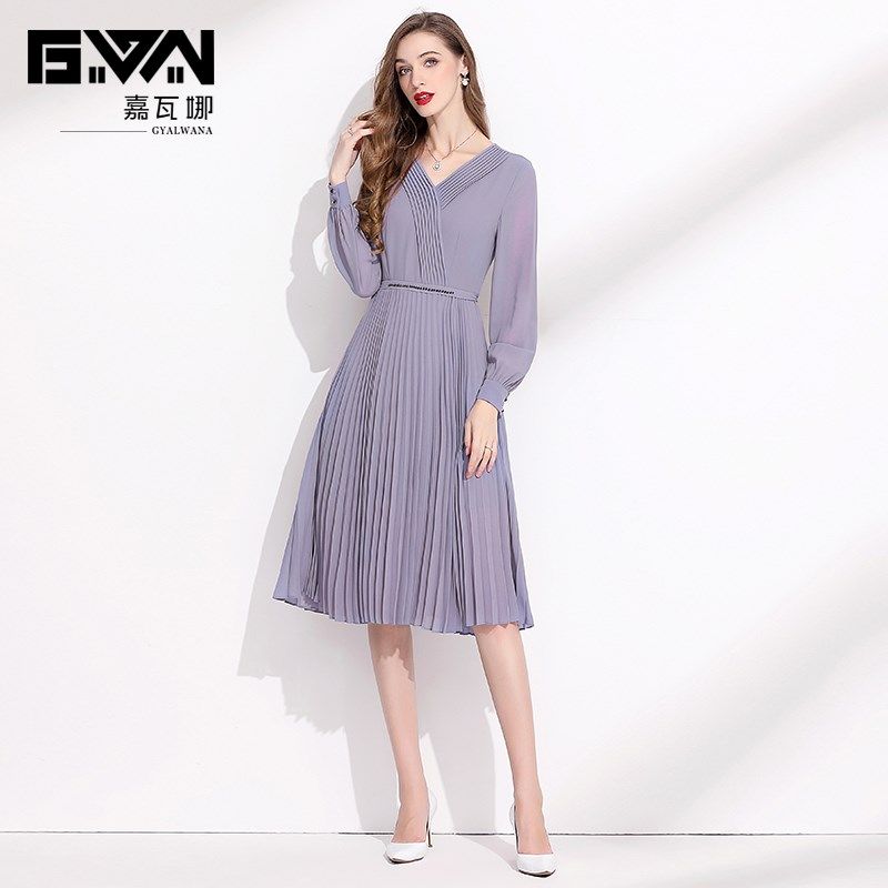 春装2024年新款百褶裙高端气质v领暗紫色长袖雪纺连衣裙女春秋