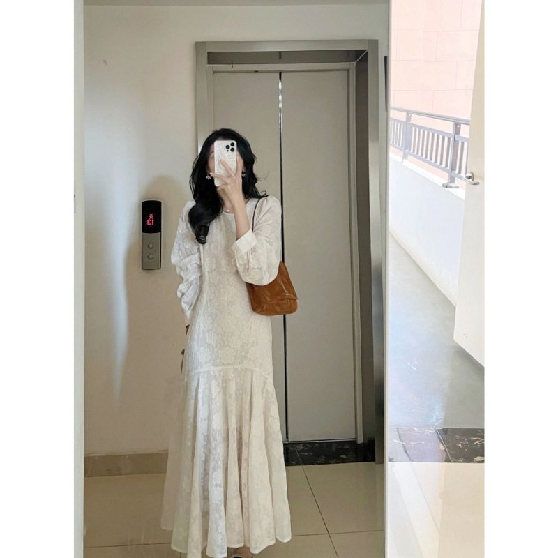 翻领白色长袖雪纺连衣裙女春装2025年新款设计感小众韩系甜美裙子