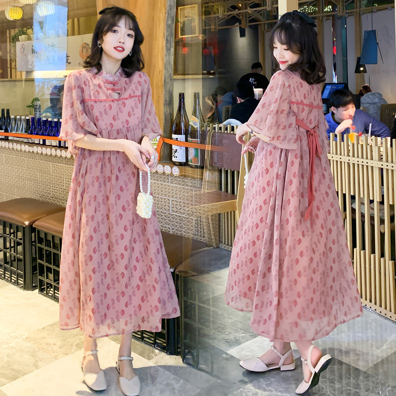 孕妇夏装大码显瘦碎花雪纺连衣裙中长款女新款春装夏季过膝长裙子