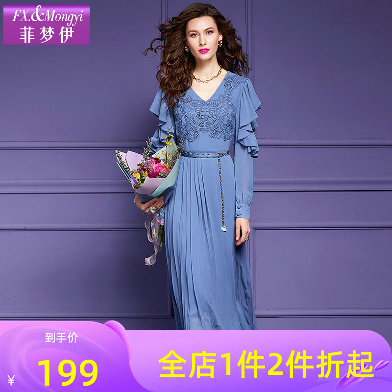 菲梦伊雪纺连衣裙女春装新款小众设计感V领收腰荷叶边绣花长裙子