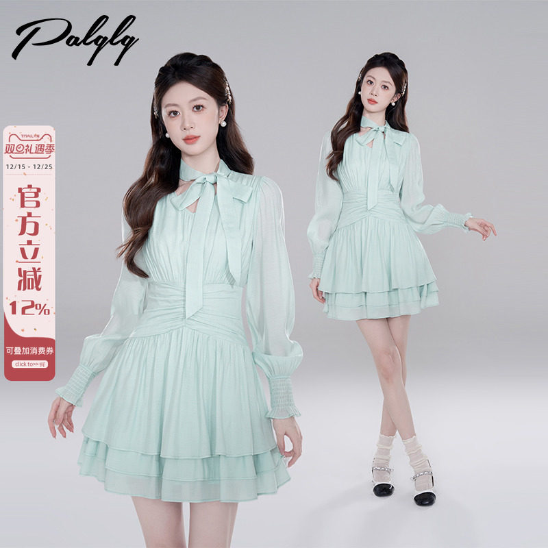 小香风湖水绿收腰长袖连衣裙女早春装高级感气质荷叶边a字雪纺裙