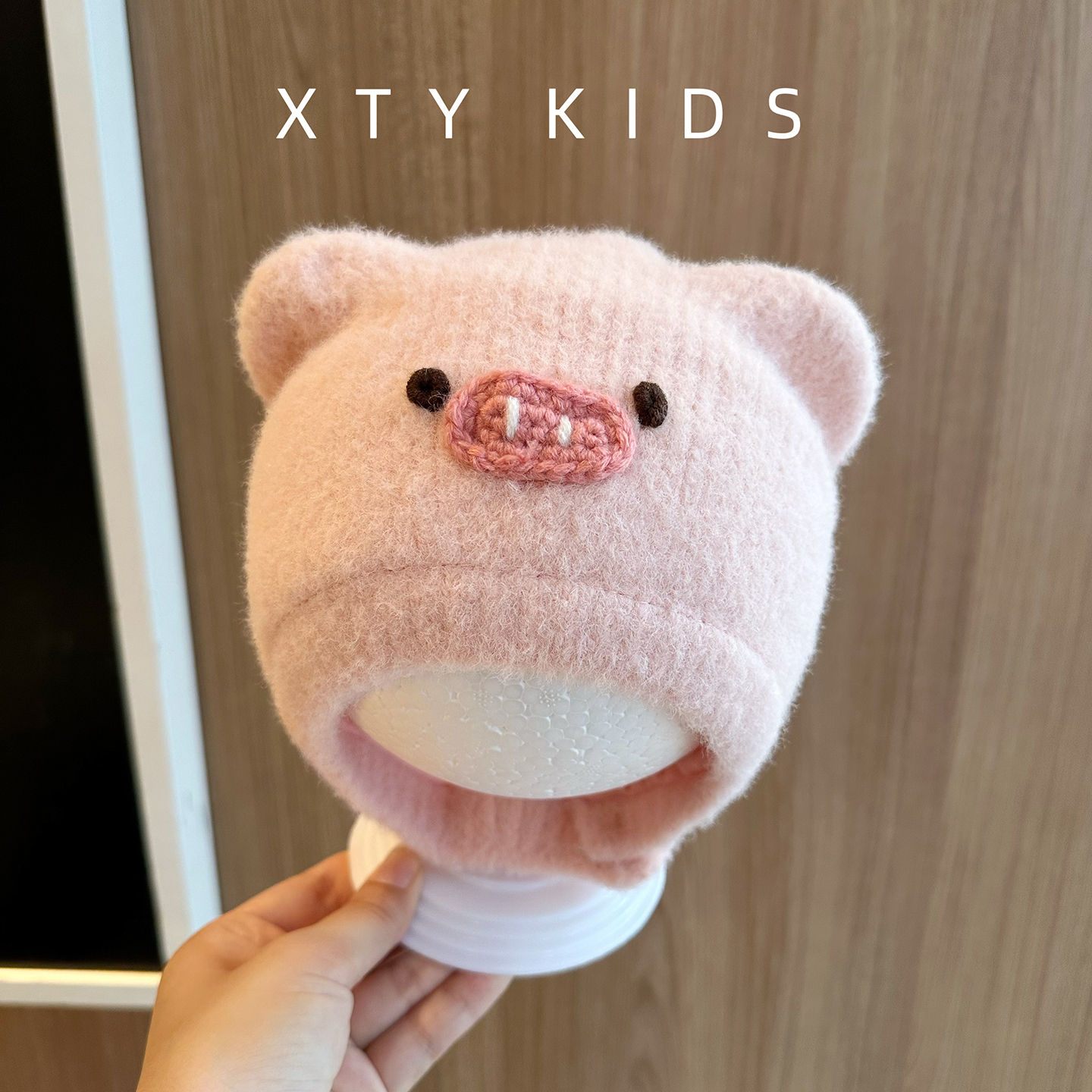 新款宝宝帽子冬季加厚毛绒可爱小猪卡通护耳包头防风小月龄婴儿帽