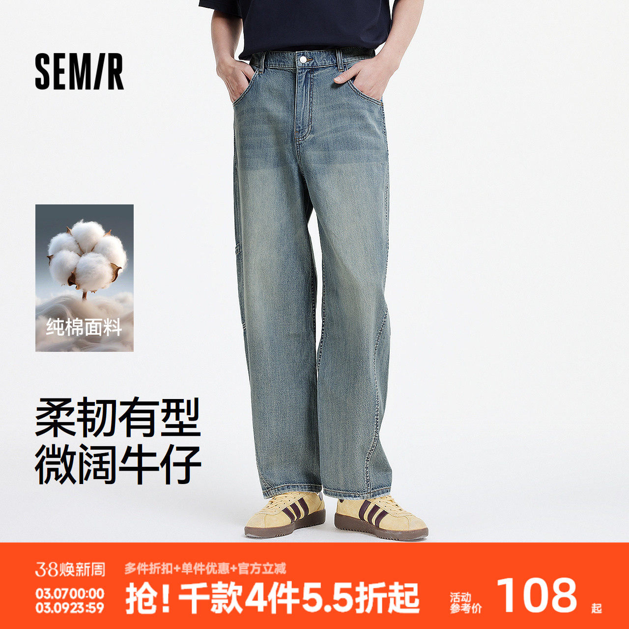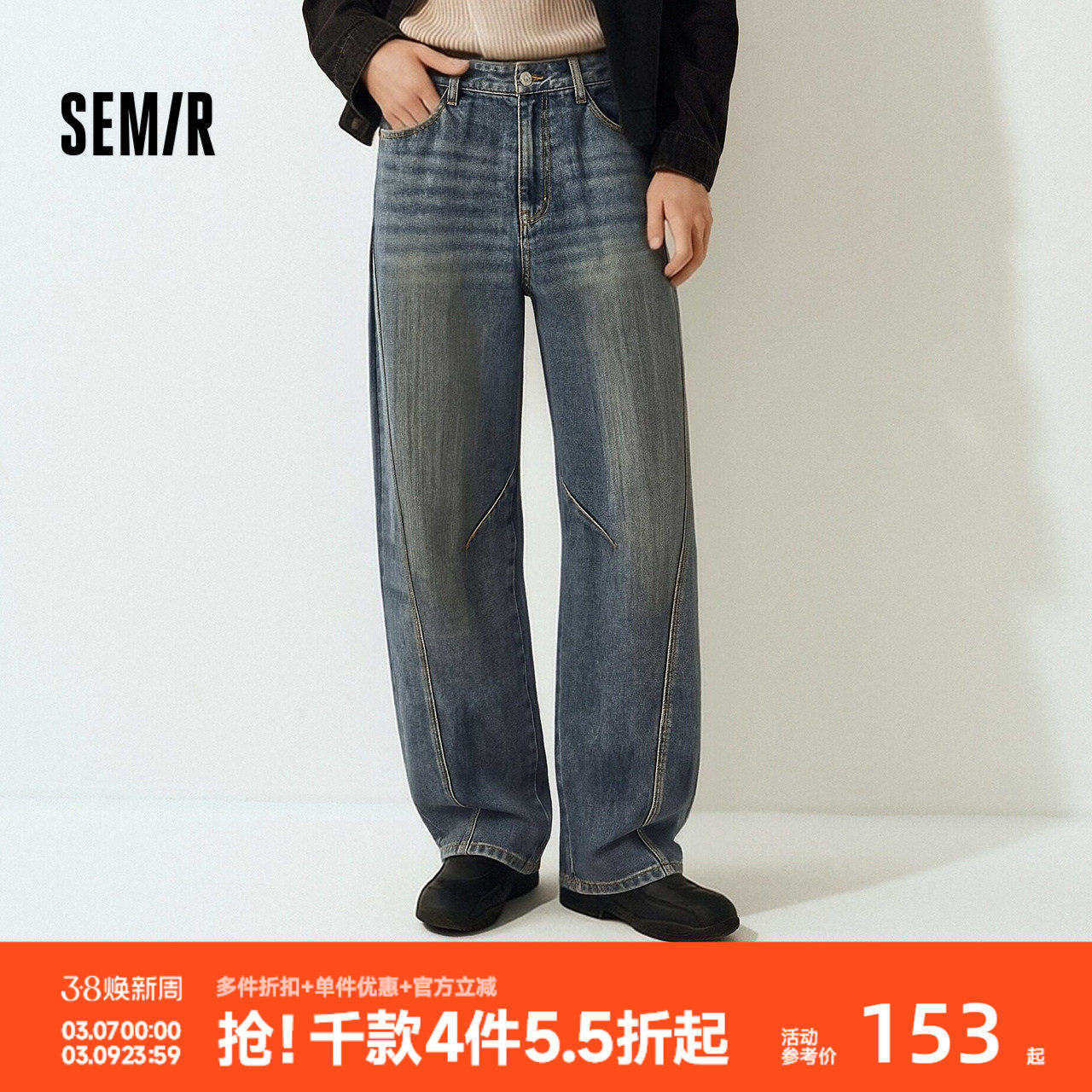 森马牛仔裤男女同款水洗阔感弯刀裤原牛宽松弧形裤26春夏款长裤子