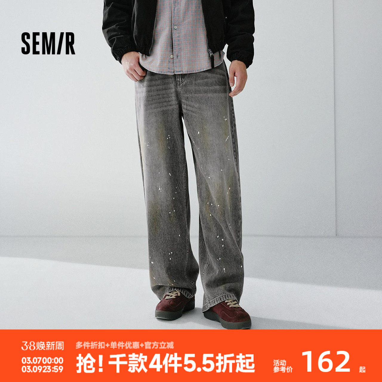 森马牛仔裤男阔感弯刀做旧水洗裤宽松弧形裤2026春夏泼墨复古长裤