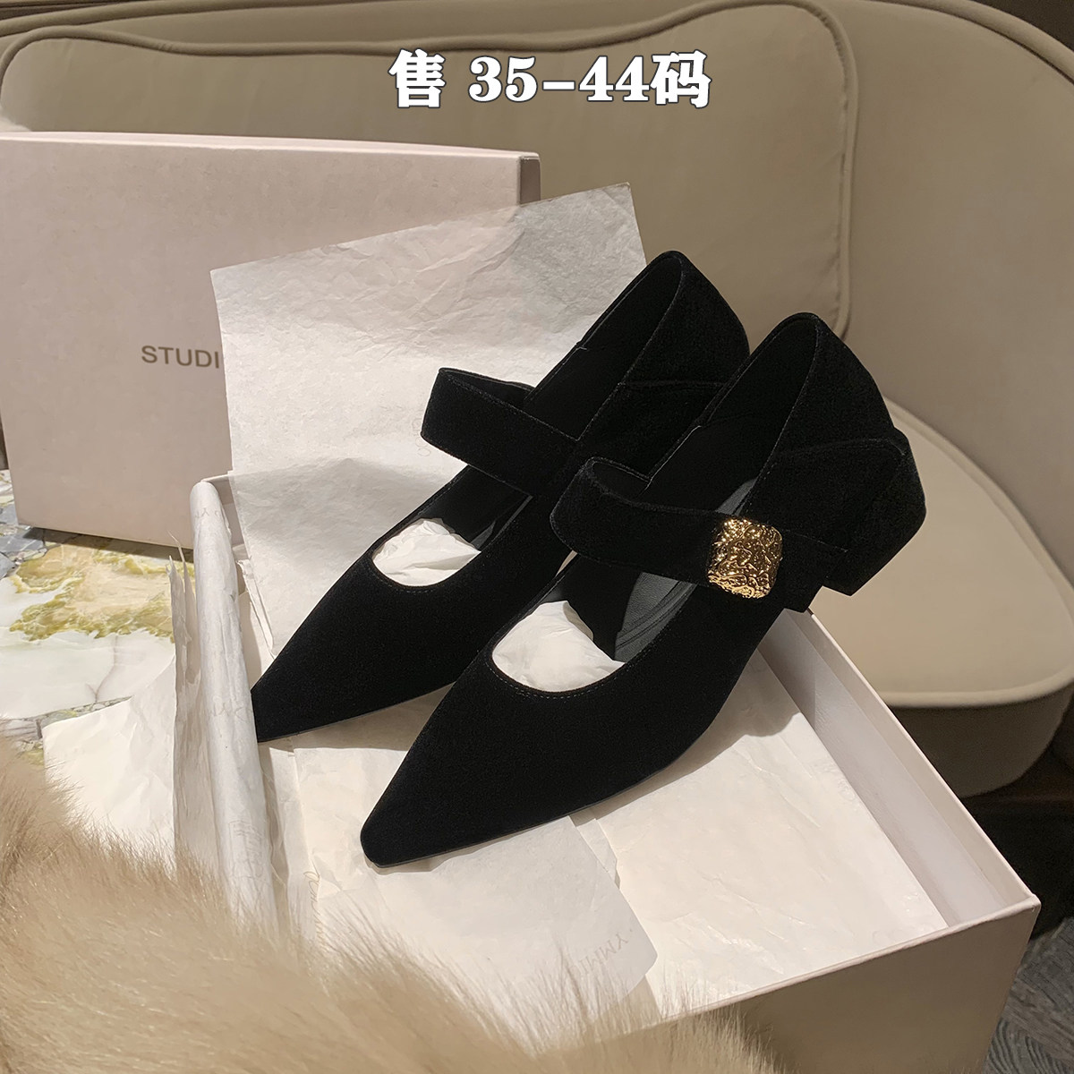 新款小尖头大码女鞋41到43中跟早春丝绒金属扣黑色单鞋女42 44码