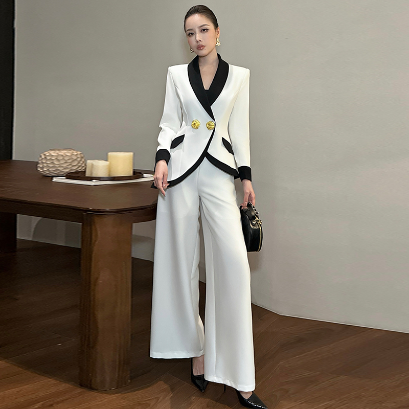 职业休闲拼色长袖修身外套高腰垂感阔腿裤大方得体两件套装女秋冬