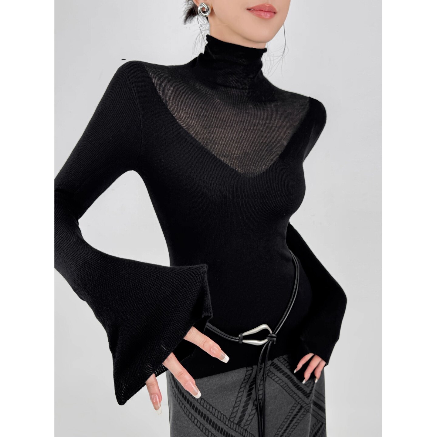 黑色纯欲高领毛衣长袖针织衫女秋冬新款镂空拼接修身内搭打底上衣