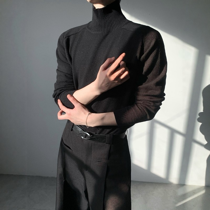 秋冬潮牌简约流行纯色保暖黑色长袖针织衫男半高领打底衫修身毛衣