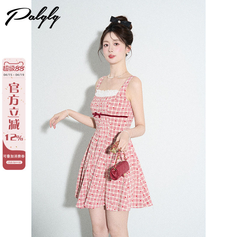 小香风甜美粉色格子背带连衣裙女夏季拼接蕾丝方领a字初恋小洋裙