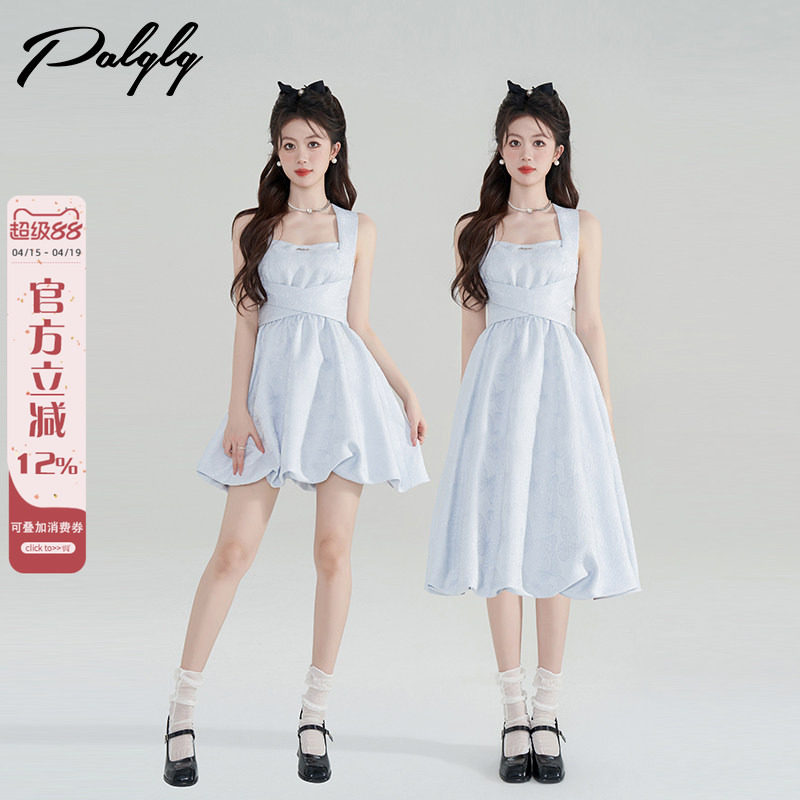 Palglg法式富家千金风黑色背带连衣裙女夏季收腰鱼骨花苞裙小黑裙