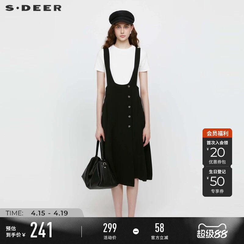 sdeer圣迪奥夏季女装通勤复古压褶拼接黑色背带裙S242Z2901