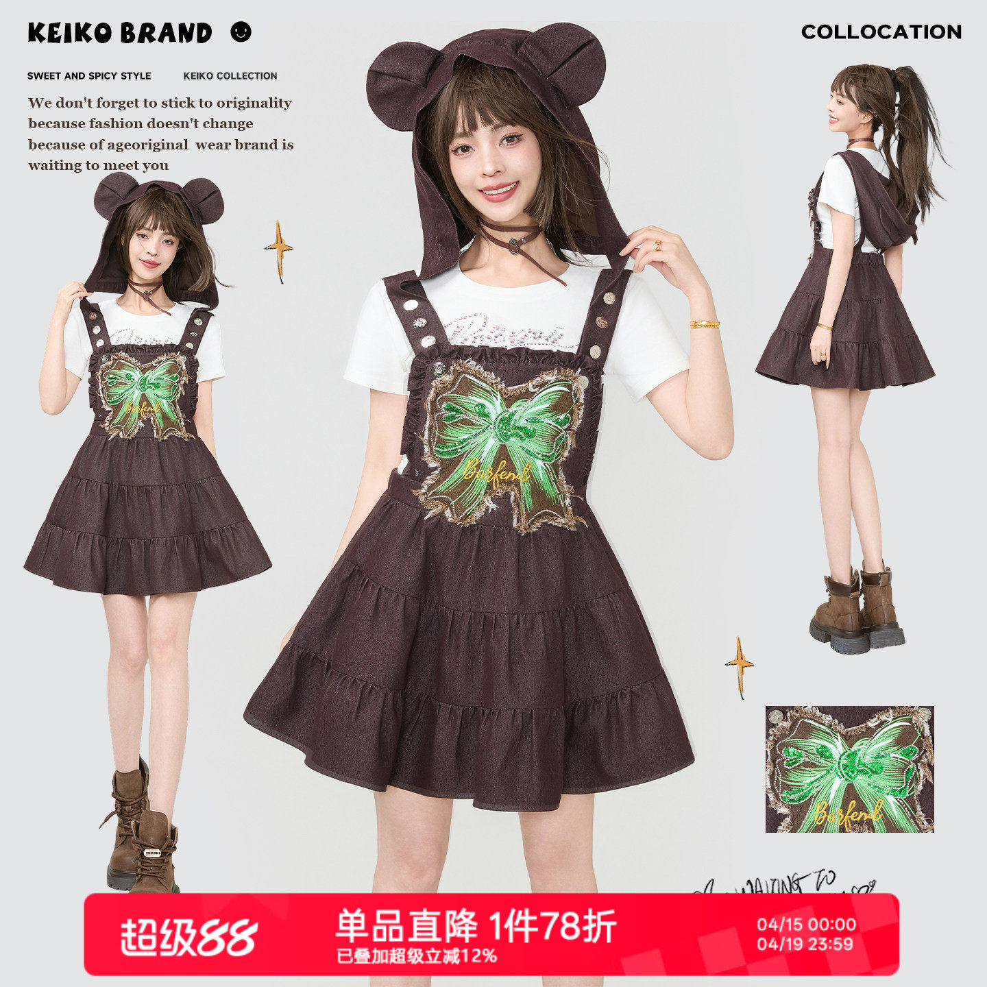 KEIKO [可拆连帽] 仿牛仔背带连衣裙夏季复古毛边蝴蝶结贴布短裙