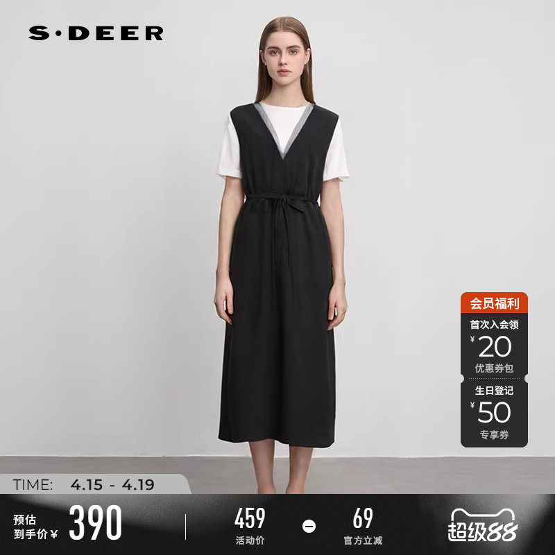 sdeer圣迪奥夏季女装撞色收腰网纱短袖背带裙套装S242Z1423