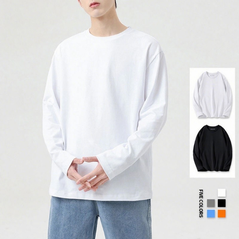 230G男士长袖t恤秋季男生新疆精梳纯棉重磅正肩纯白色宽松打底衫