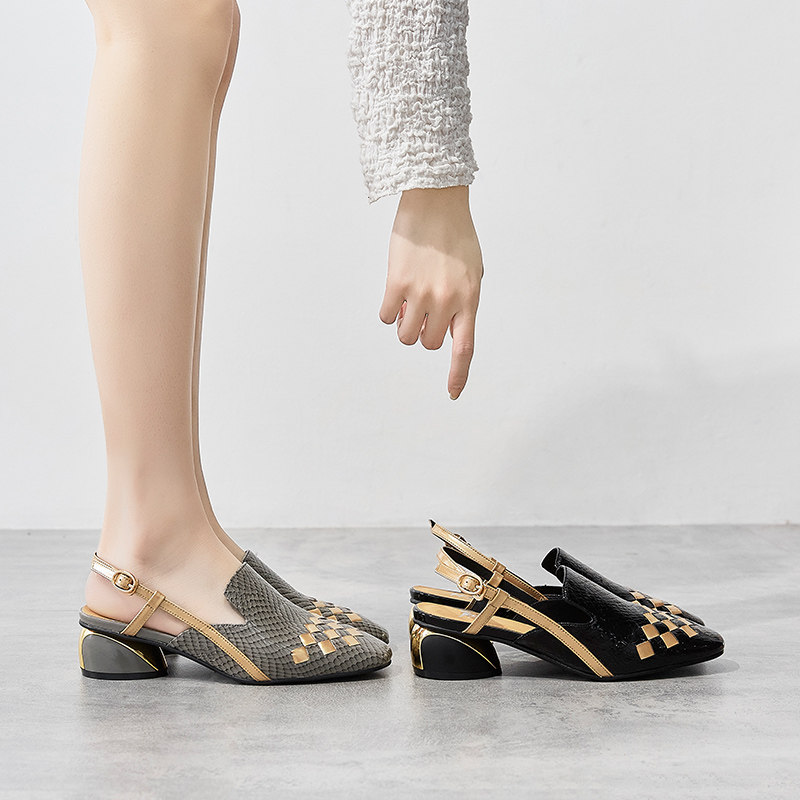 舒适软底真皮包头粗跟凉鞋女夏中跟2025年新款时装气质配裙女鞋