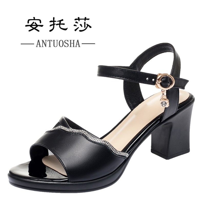真皮水钻凉鞋女夏中跟新款粗跟女鞋防滑时尚妈妈鞋百搭软底凉皮鞋