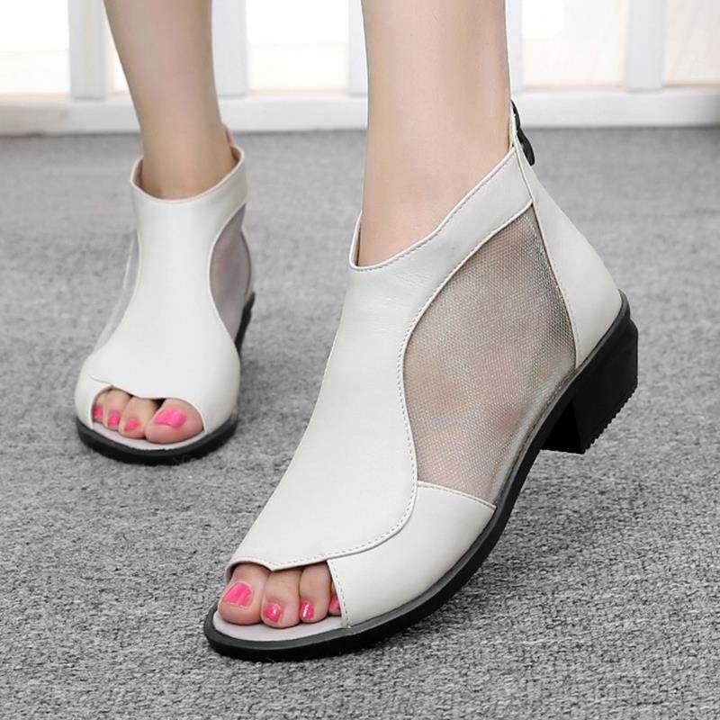 高档凉鞋女夏中跟鱼嘴真皮中妈妈鞋2网02新款粗5跟镂空纱年凉靴子