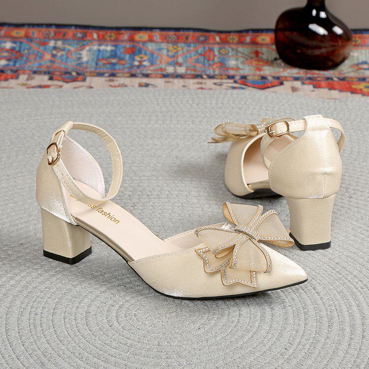 中空一字扣高跟鞋粗跟尖头蝴蝶结单鞋女2025年新款凉鞋女夏中跟春