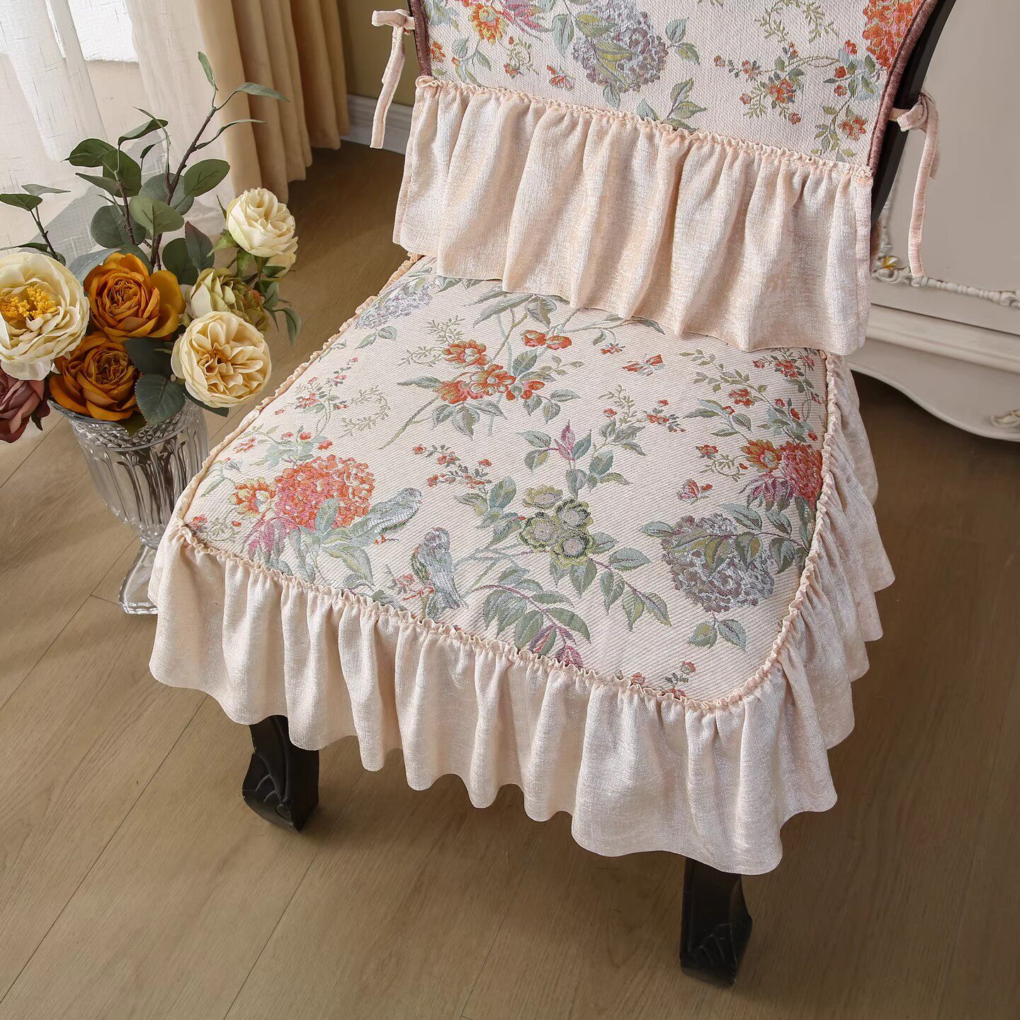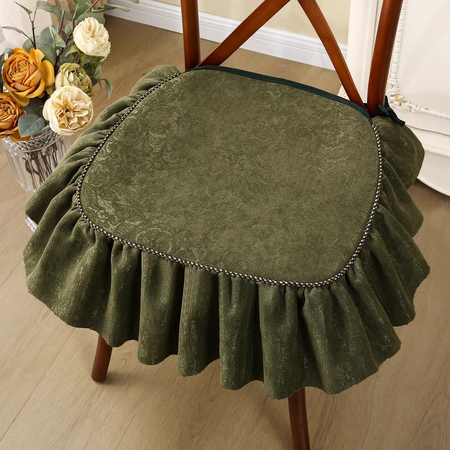 美式复古餐椅坐垫荷叶边四季通用亚麻椅子垫欧式绿色花卉椅垫拆洗