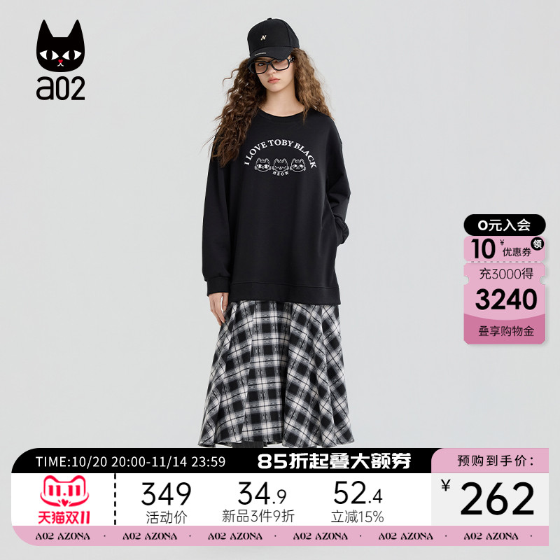 a02黑猫系列黑色假两件连衣裙女2025新款秋季宽松设计感卫衣裙子