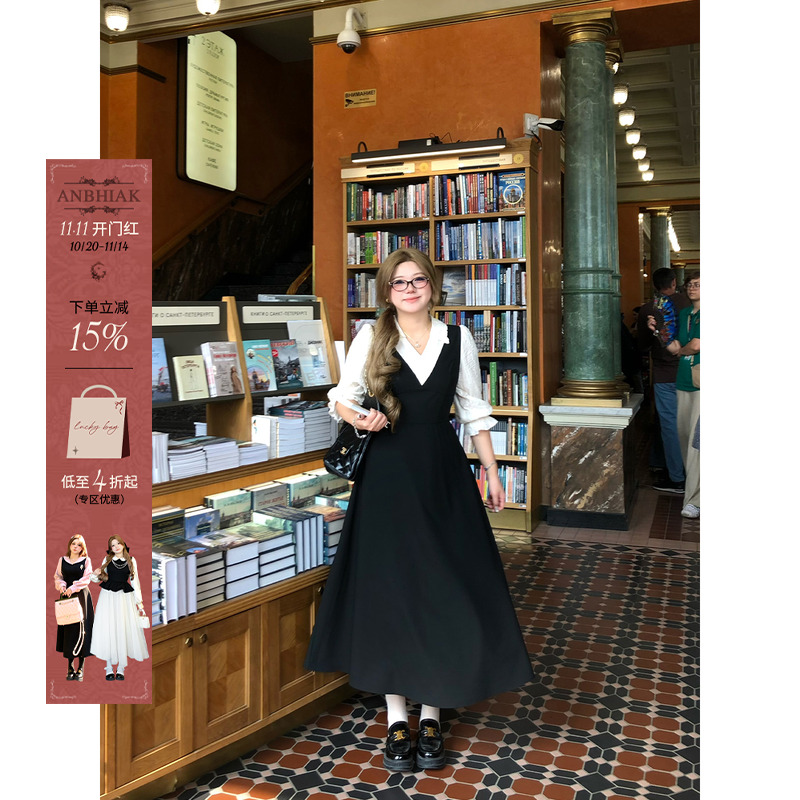 晚白2025秋冬新款轻奢假两件背心裙大气黑裙子气质小个子连衣裙女